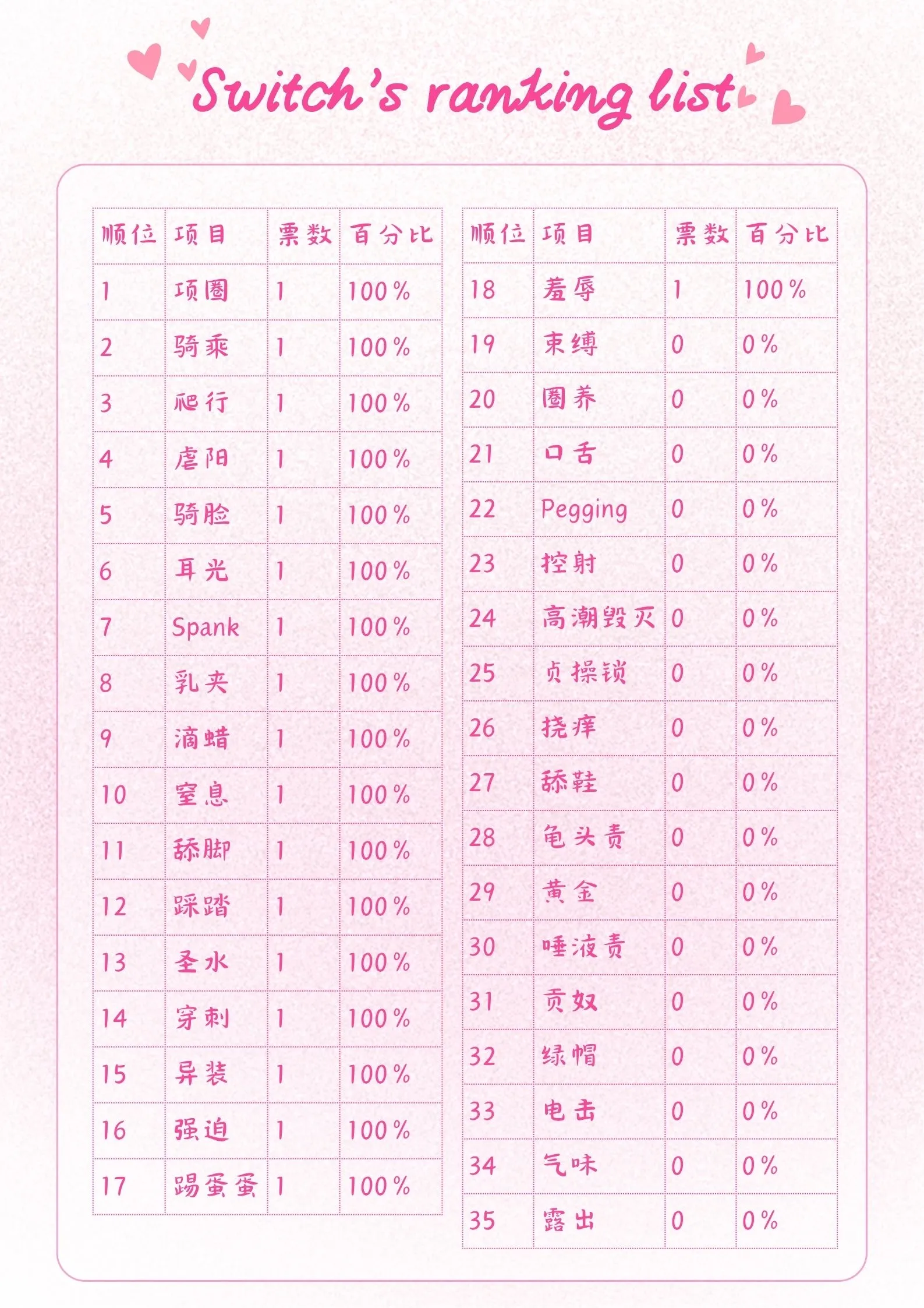 LiHeng666:↑yu-e:↑LiHeng666:↑yu-e:↑sdkpeter99909:↑yu-e:↑截止至2025年6月24日,共收到35份小瓶子,其中Dom:4份,Sub:30份,Switch:1份。