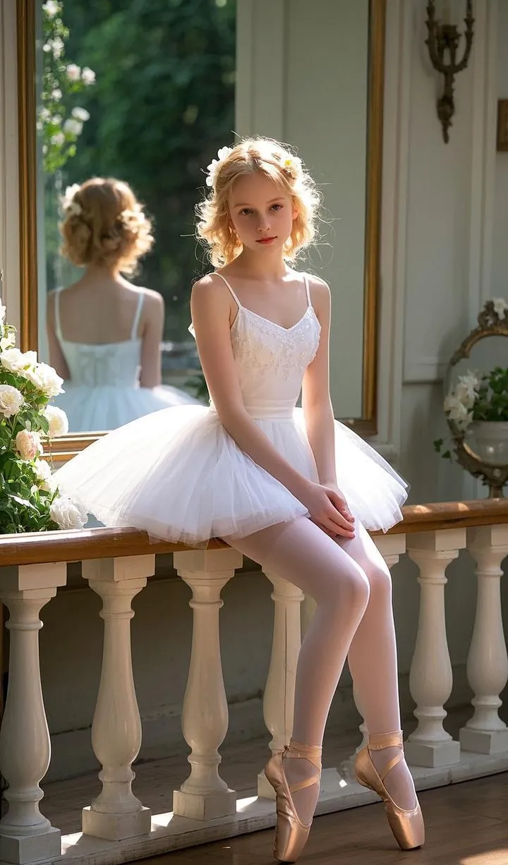 她有着一张精致的白人面孔,金色的短发微微卷曲。她身穿一袭纯白色的小裙子,裙摆轻盈地垂落,脚上踩着一双淡金色的芭蕾舞鞋和洁白的白丝,整个人仿佛从童话中走出的精灵。