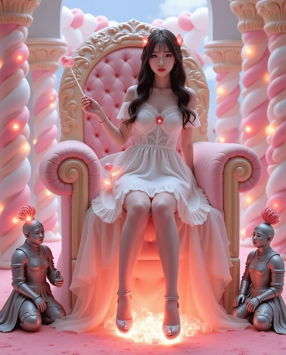 身高138cm的苍白肤色萝莉,穿着纯白蕾丝洛丽塔裙,裙摆缀满糖果装饰。过膝白丝袜包裹着纤细双腿,脚踩20cm厚松糕鞋(鞋底印有粉色爱心图案)。左手始终握着棒棒糖形状的魔法杖,发间别着会发光的蝴蝶结发卡。
