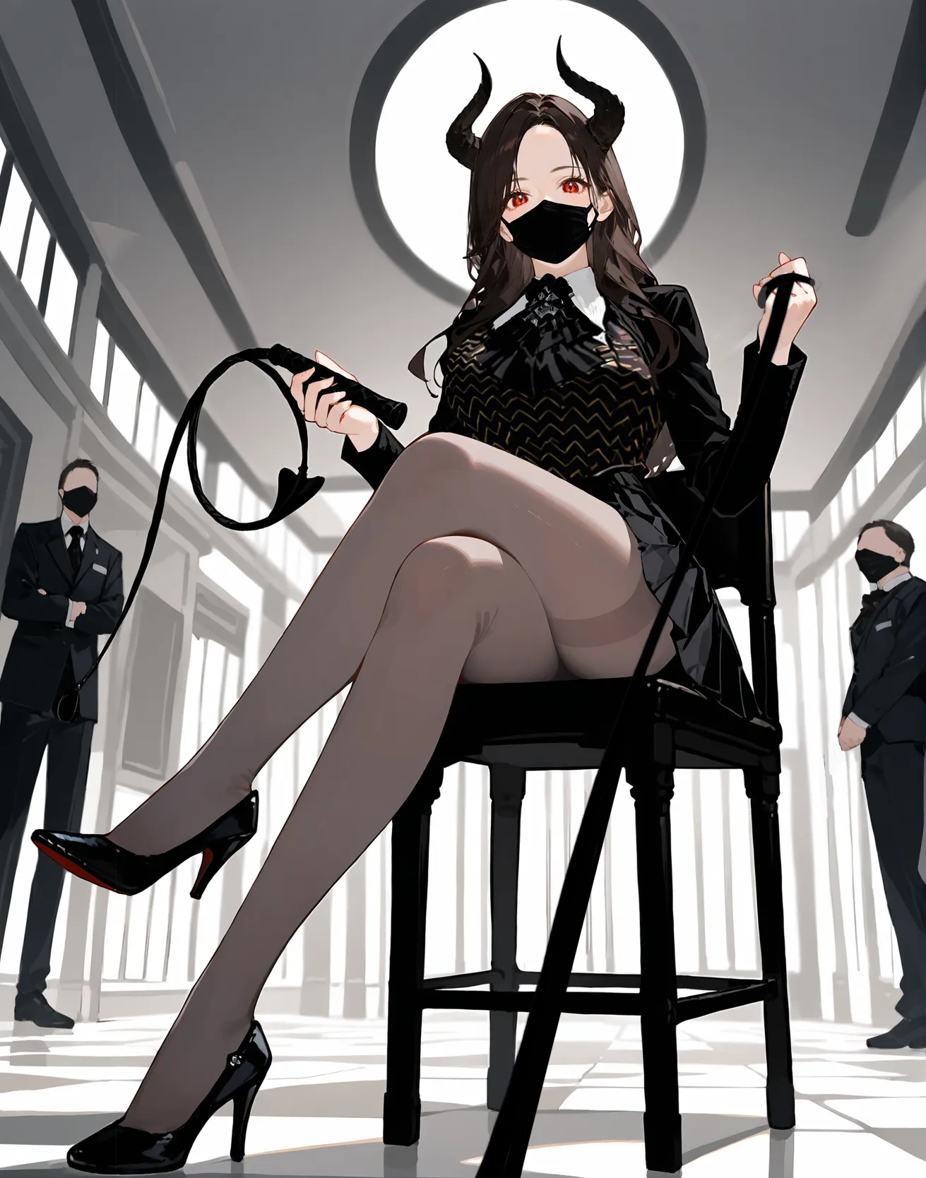 白色半透明的露腰衬衣穿在上身,低胸的领口上一对浑圆硕大的巨乳呼之欲出,半边雪白的乳肉暴露在外,挤出一道惹火的乳沟,纤细的腰肢上有着红色的诡异印记,下身穿着一条黑色包臀超短裙,将肥圆的丰臀紧裹出一道性感的弧度,高挑浑圆的美腿上贴着一层肉色丝袜,光滑油亮,踏着一双白色的水晶高跟鞋,在戒卫的拦截搜查后,金发少女走进了酒馆消失在阴影中。