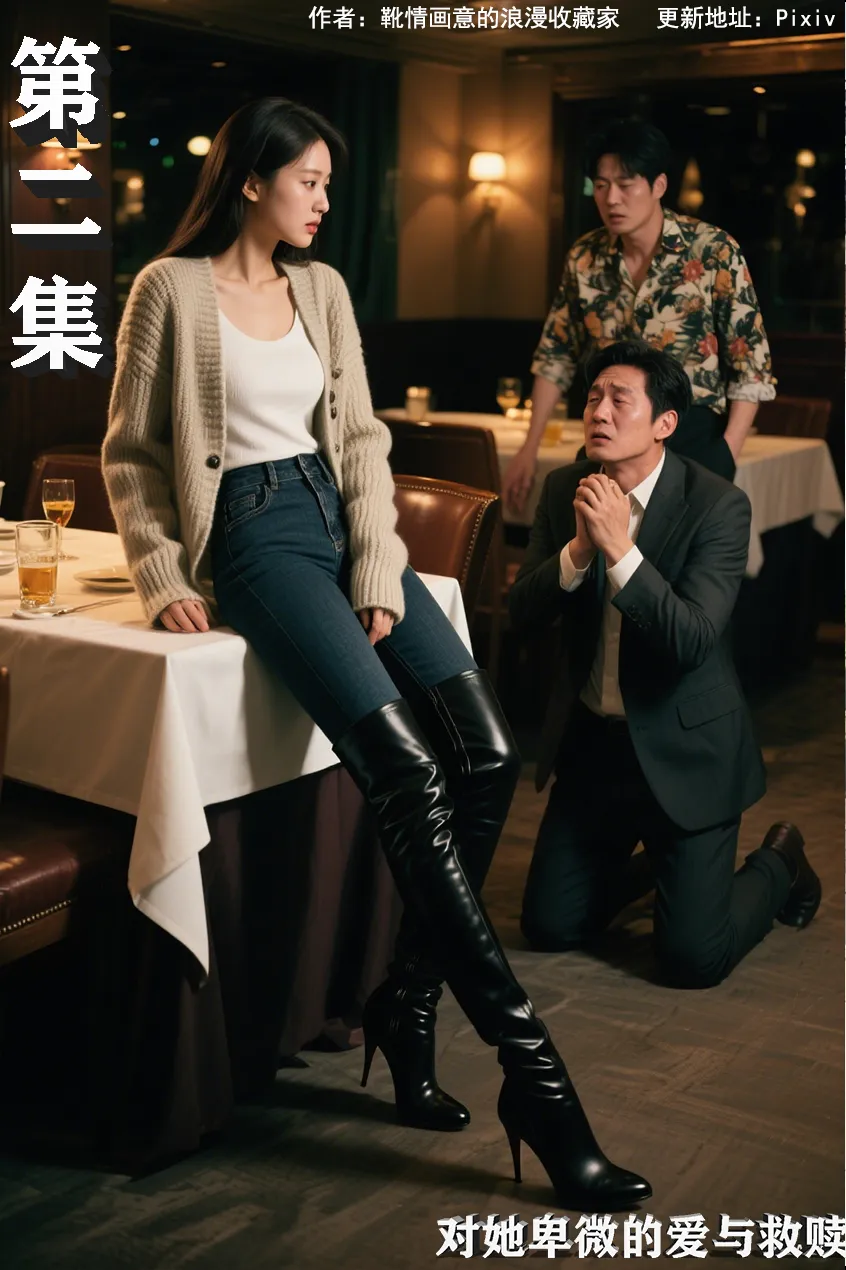 长靴的靴跟在地面上轻轻一转,发出清脆的 “咔哒” 声,像是一记轻锤,敲在这尴尬又微妙的氛围里。只见她微微俯下身,伸出手来扶我,那长靴的靴筒几乎擦到了我的手臂,皮革的质感和她身上淡淡的香水味交织在一起,让我愈发窘迫,却又有些莫名的心动 。